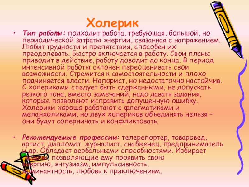 с напряжением. Любит трудности и препятствия, способен их преодолевать. Быстро включается в работу. Свои планы приводит в действие, работу доводит до конца. В период интенсивной работы склонен переоценивать свои возможности. Стремится к самостоятельности и плохо подчиняется власти. Напорист, но недостаточно настойчив. С холериками следует быть сдержанными, не допускать резкого тона, вместо замечаний, надо давать задания, которые позволяют исправить допущенную ошибку. Холерики хорошо работают с флегматиками и меланхоликами, но двух холериков объединять нельзя – они будут соперничать и конфликтовать.