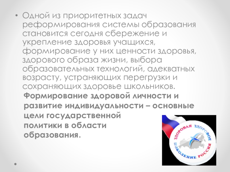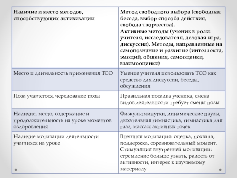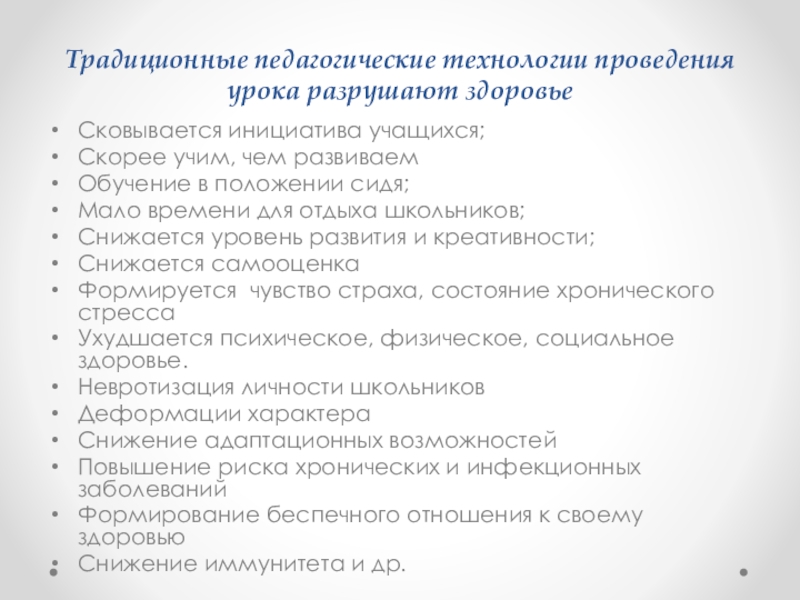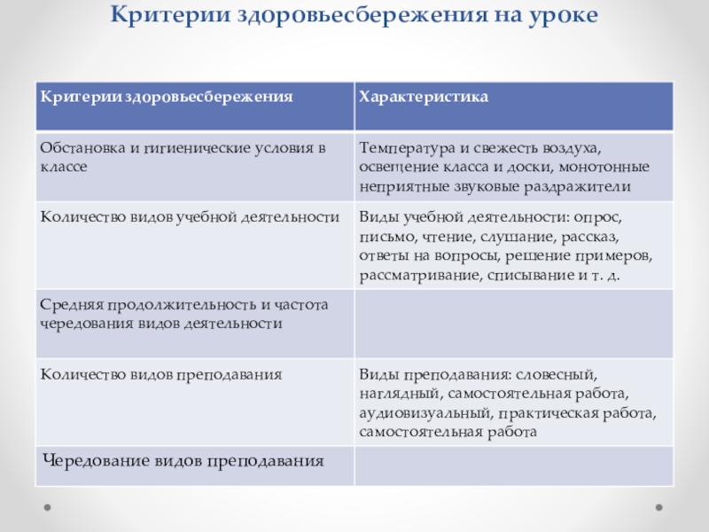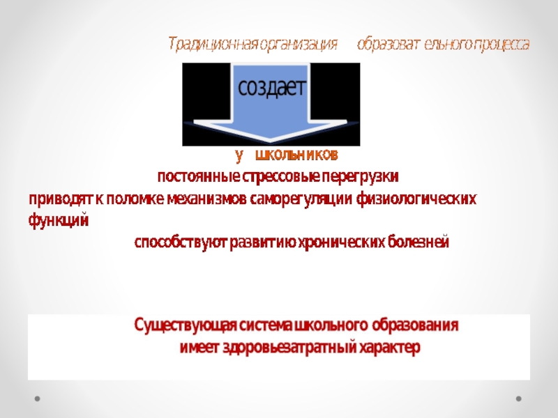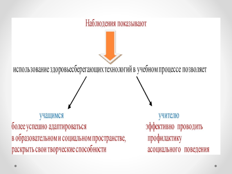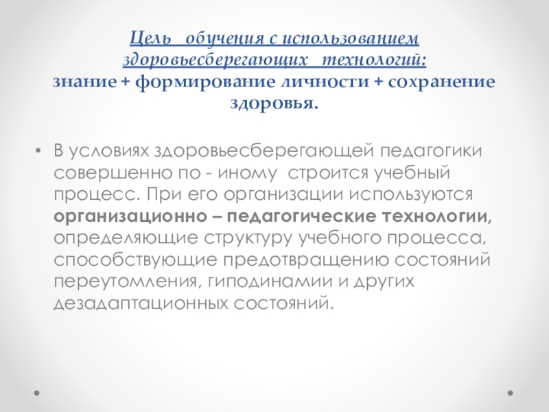 В условиях здоровьесберегающей педагогики совершенно по - иному строится учебный процесс. При его организации используются организационно – педагогические технологии, определяющие структуру учебного процесса, способствующие предотвращению состояний переутомления, гиподинамии и других дезадаптационных состояний.