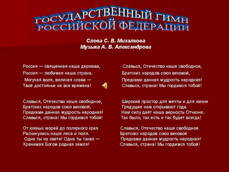 Славься, Отечество наше свободное,  Братских народов союз вековой,  Предками данная мудрость народная!  Славься, страна! Мы гордимся тобой!