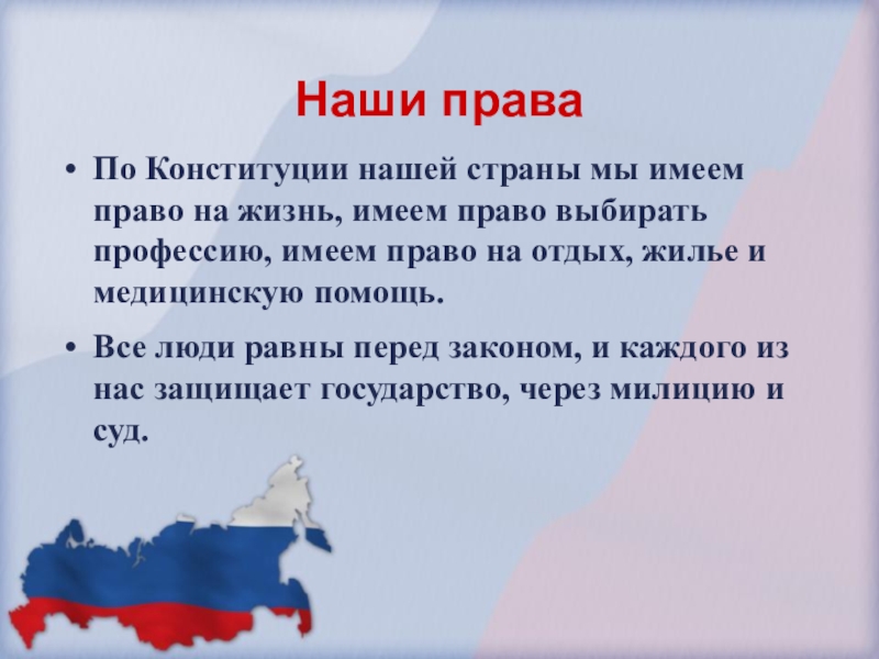 Наши праваПо Конституции нашей страны мы имеем право на жизнь, имеем право выбирать профессию, имеем право на