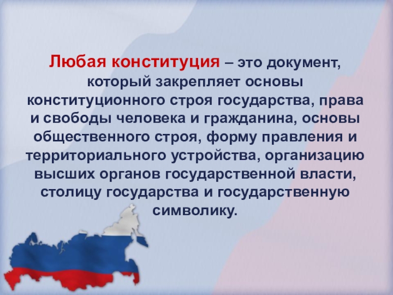 Любая конституция – это документ, который закрепляет основы конституционного строя государства, права и свободы человека и гражданина,