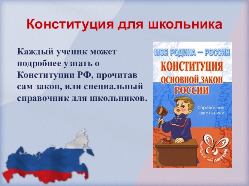 Конституция для школьникаКаждый ученик может подробнее узнать о Конституции РФ, прочитав сам закон, или специальный справочник для