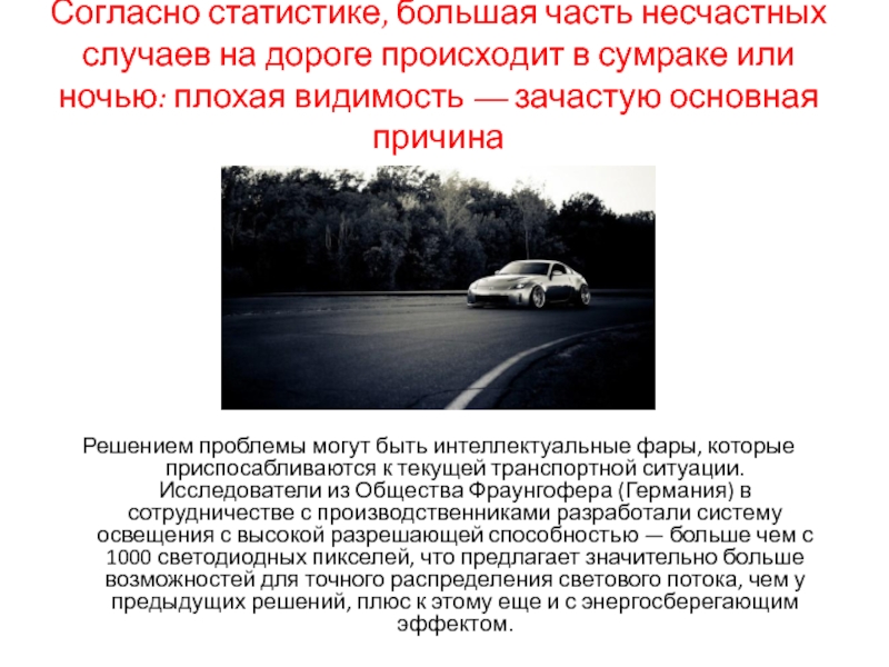 Решением проблемы могут быть интеллектуальные фары, которые приспосабливаются к текущей транспортной ситуации. Исследователи из Общества Фраунгофера (Германия) в сотрудничестве с производственниками разработали систему освещения с высокой разрешающей способностью — больше чем с 1000 светодиодных пикселей, что предлагает значительно больше возможностей для точного распределения светового потока, чем у предыдущих решений, плюс к этому еще и с энергосберегающим эффектом.