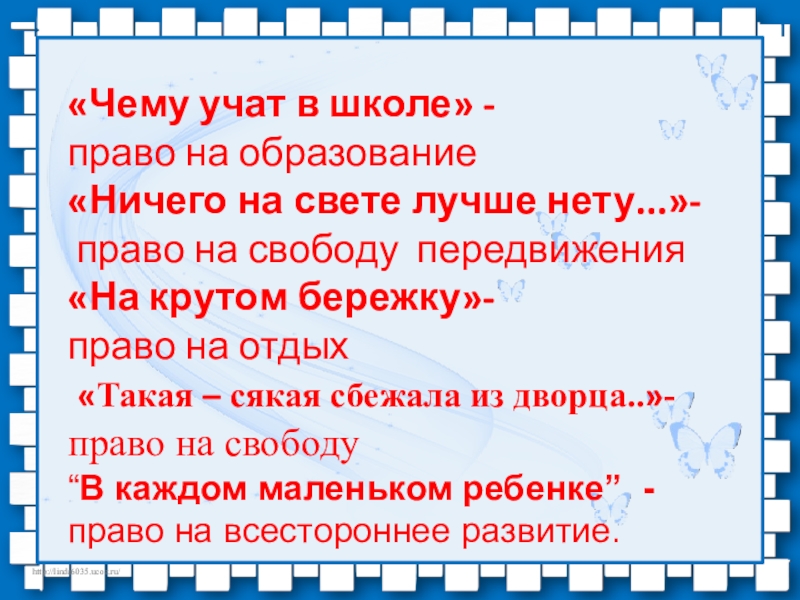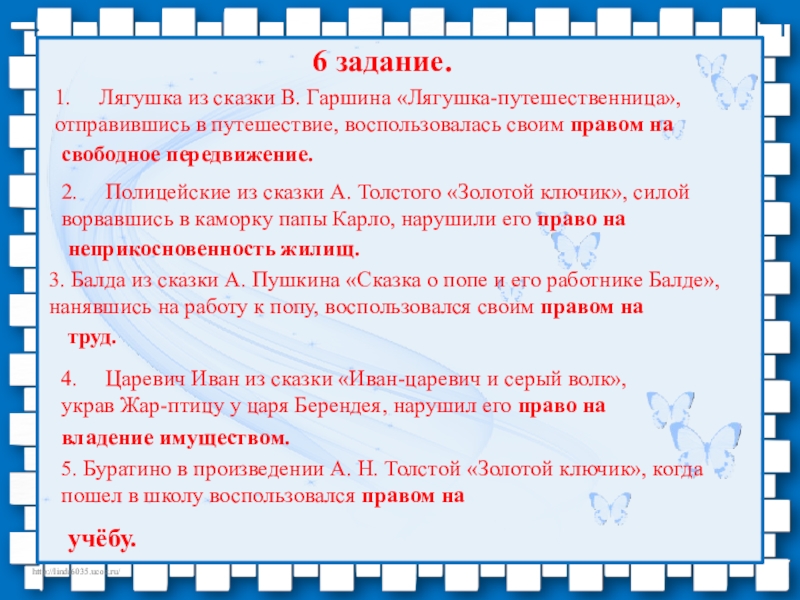 5. Буратино в произведении А. Н. Толстой «Золотой ключик», когда пошел в школу воспользовался правом на
