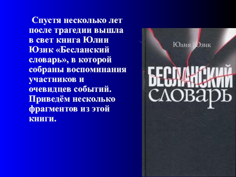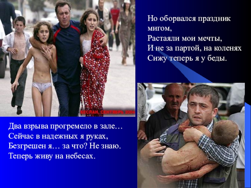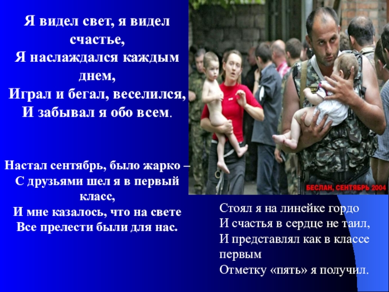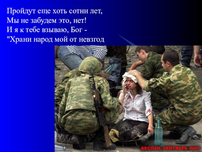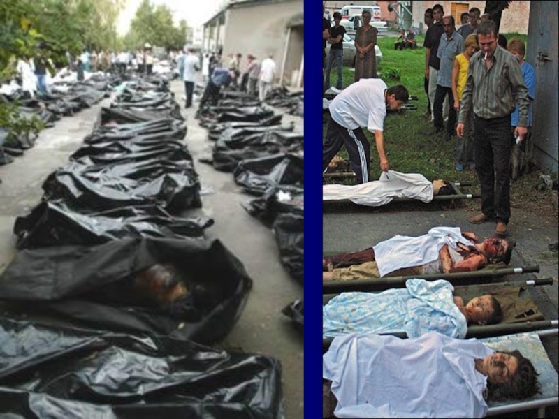 что эти ошибки не только оскорбляют, унижают, но и ломают жизнь других людей. Война, терроризм наносит им не только физические, но и психологические травмы, от которых люди могут страдать на протяжении многих лет. Бесланская трагедия явилась свидетельством того, как терроризм вероломно обживает рядом с нами жизненное пространство, а затем беспощадно освобождает его от наших детей, лишая всех нас будущего, подрывая в нас важнейшее свойство – веру в Человека и доверие к нему.