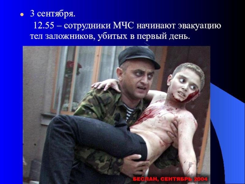 12.55 – сотрудники МЧС начинают эвакуацию тел заложников, убитых в