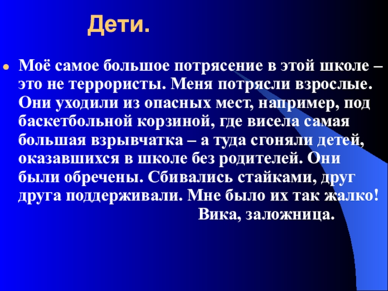 Меня потрясли взрослые. Они уходили из опасных мест, например, под баскетбольной корзиной, где висела самая большая взрывчатка – а туда сгоняли детей, оказавшихся в школе без родителей. Они были обречены. Сбивались стайками, друг друга поддерживали. Мне было их так жалко! Вика, заложница.