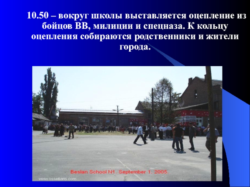 Слайд 6 10.50 – вокруг школы выставляется оцепление из бойцов ВВ, милиции и