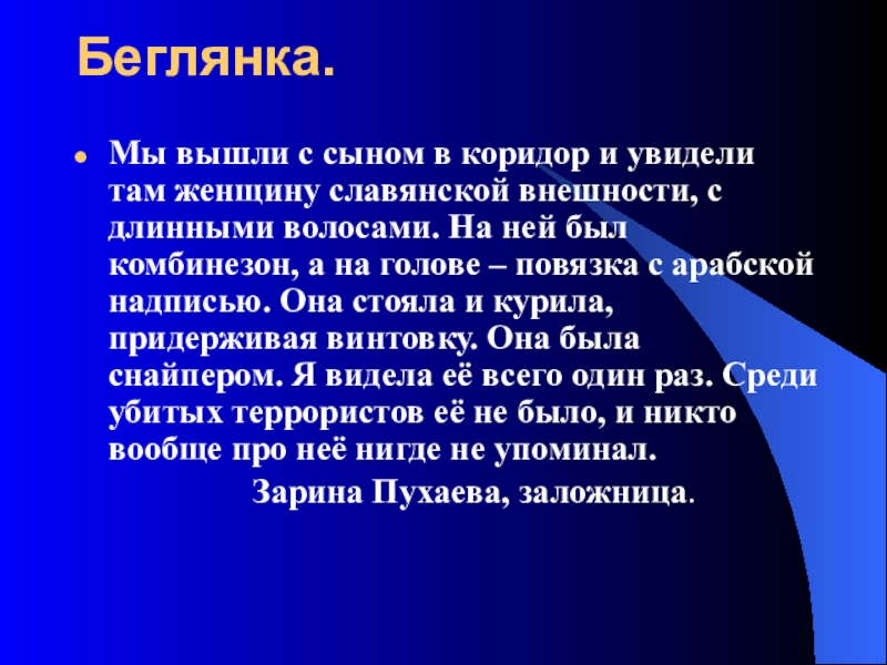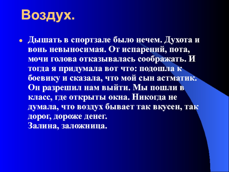 пота, мочи голова отказывалась соображать. И тогда я придумала вот что: подошла к боевику и сказала, что мой сын астматик. Он разрешил нам выйти. Мы пошли в класс, где открыты окна. Никогда не думала, что воздух бывает так вкусен, так дорог, дороже денег. Залина, заложница.