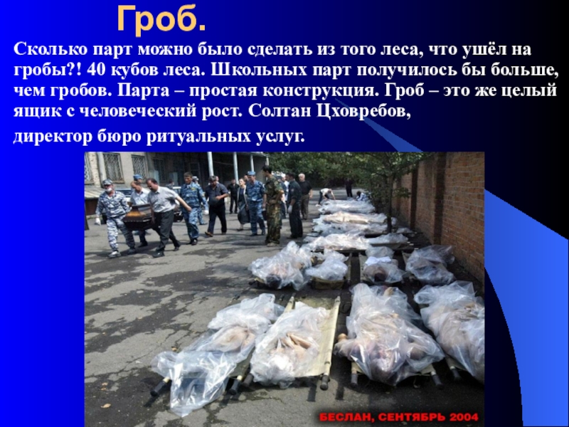 гробы?! 40 кубов леса. Школьных парт получилось бы больше, чем гробов. Парта – простая конструкция. Гроб – это же целый ящик с человеческий рост. Солтан Цховребов,