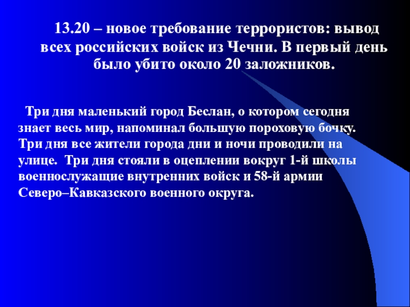 Слайд 11 13.20 – новое требование террористов: вывод всех российских войск из Чечни.