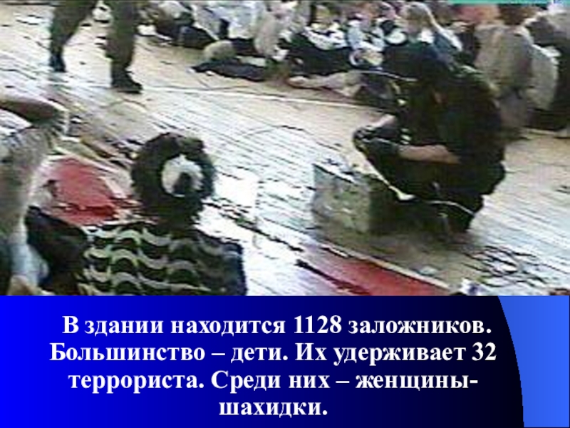Слайд 7 В здании находится 1128 заложников. Большинство – дети. Их удерживает 32