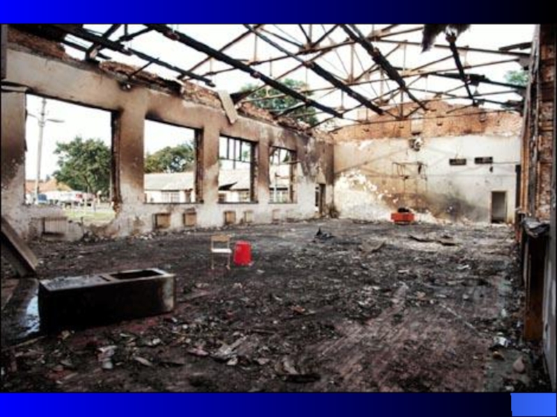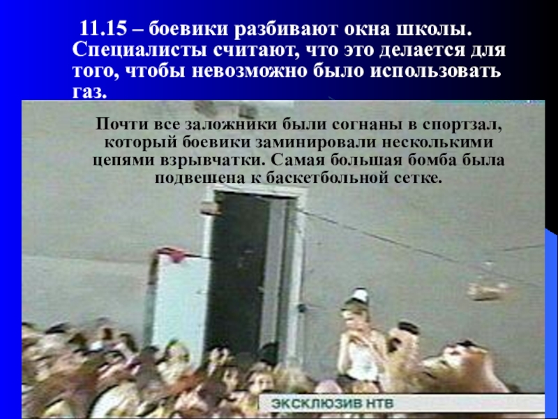 Слайд 9 11.15 – боевики разбивают окна школы. Специалисты считают, что это делается