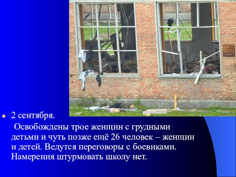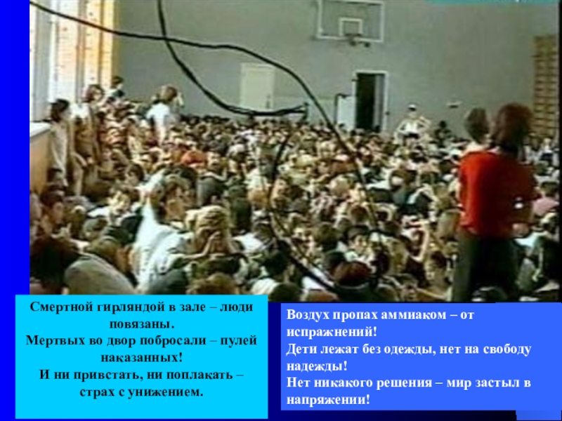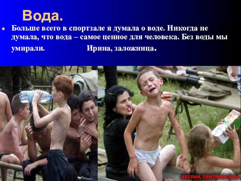 1 сентября школа стала адом. Заложниками оказались дети и взрослые - 1116 человек. Стояла изнурительная жара. Весь день в душном спортзале дети сидели голодными, просили пить. Принять еду и питье для детей боевики согласились лишь вечером. И тут же отказались.