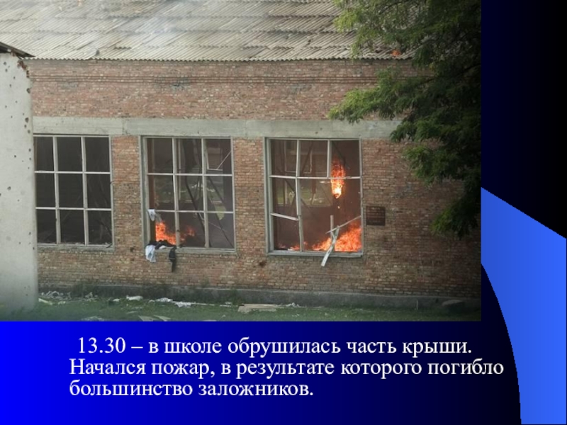 Слайд 17 13.30 – в школе обрушилась часть крыши. Начался пожар, в результате