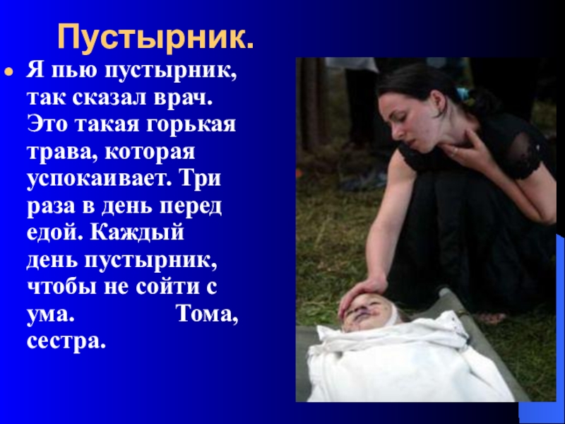 успокаивает. Три раза в день перед едой. Каждый день пустырник, чтобы не сойти с ума. Тома, сестра.