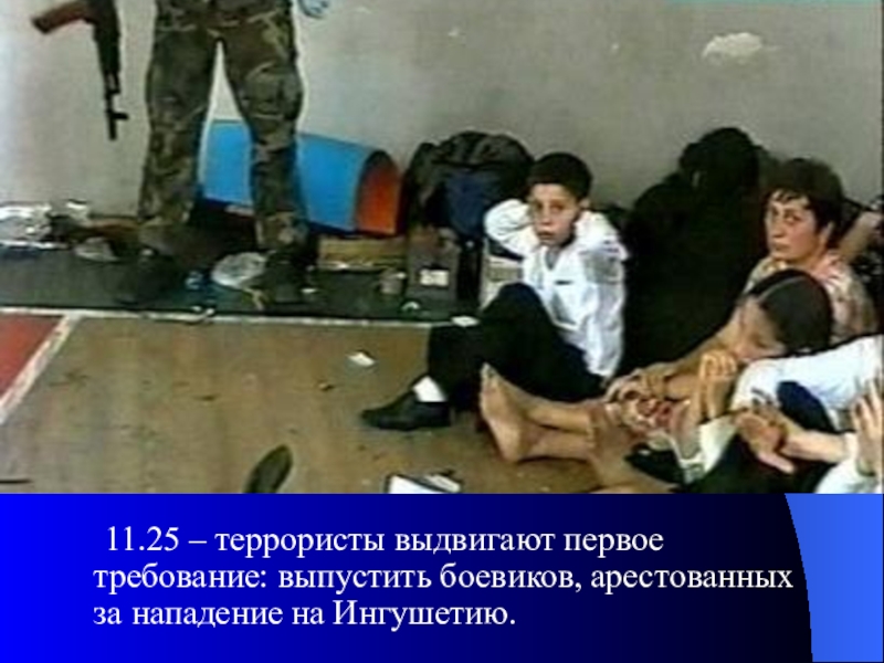 Слайд 10 11.25 – террористы выдвигают первое требование: выпустить боевиков, арестованных за нападение