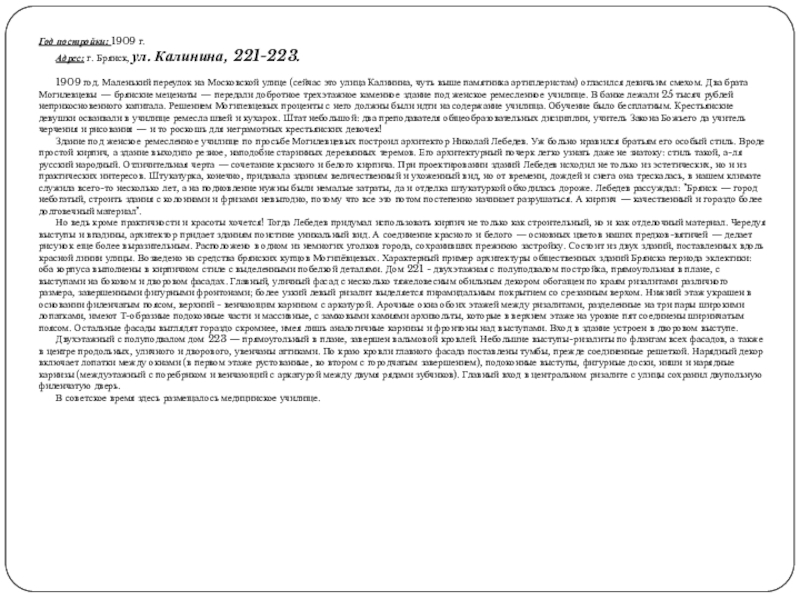 Но ведь кроме практичности и красоты хочется! Тогда Лебедев придумал использовать кирпич не только как строительный, но и как отделочный материал. Чередуя выступы и впадины, архитектор придает зданиям поистине уникальный вид. А соединение красного и белого — основных цветов наших предков-вятичей — делает рисунок еще более выразительным. Расположено в одном из немногих уголков города, сохранивших прежнюю застройку. Состоит из двух зданий, поставленных вдоль красной линии улицы. Возведено на средства брянских купцов Могилёвцевых. Характерный пример архитектуры общественных зданий Брянска периода эклектики: оба корпуса выполнены в кирпичном стиле с выделенными побелкой деталями. Дом 221 - двухэтажная с полуподвалом постройка, прямоугольная в плане, с выступами на боковом и дворовом фасадах. Главный, уличный фасад с несколько тяжеловесным обильным декором обогащен по краям ризалитами различного размера, завершенными фигурными фронтонами; более узкий левый ризалит выделяется пирамидальным покрытием со срезанным верхом. Нижний этаж украшен в основании филенчатым поясом, верхний - венчающим карнизом с аркатурой. Арочные окна обоих этажей между ризалитами, разделенные на три пары широкими лопатками, имеют Т-образные подоконные части и массивные, с замковыми камнями архивольты, которые в верхнем этаже на уровне пят соединены ширинчатым поясом. Остальные фасады выглядят гораздо скромнее, имея лишь аналогичные карнизы и фронтоны над выступами. Вход в здание устроен в дворовом выступе.