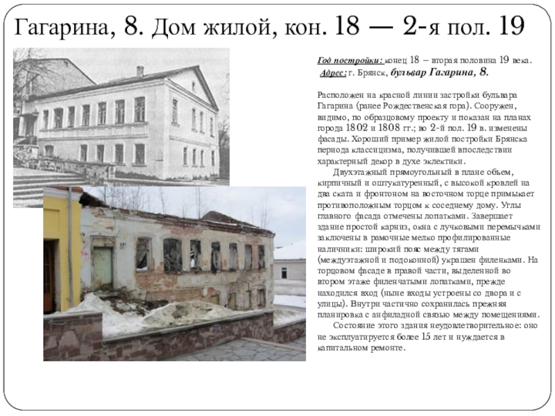 Слайд 5Гагарина, 8. Дом жилой, кон. 18 — 2-я пол. 19 в.