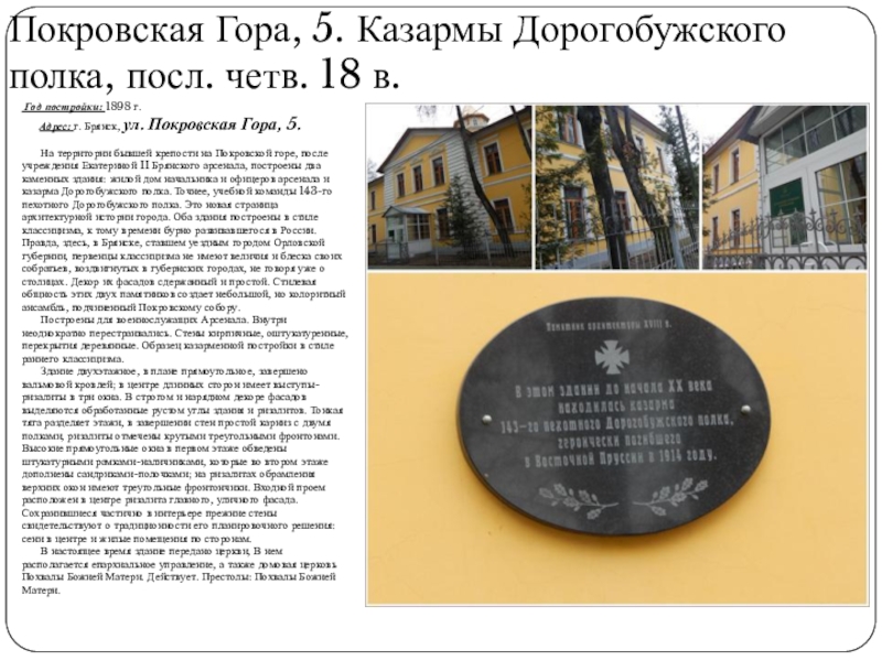 Слайд 23Покровская Гора, 5. Казармы Дорогобужского полка, посл. четв. 18 в.