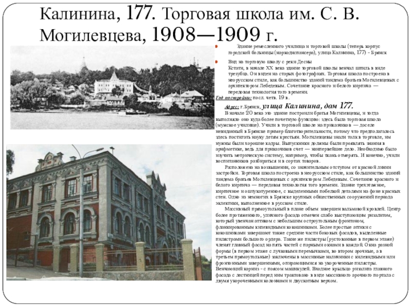 Слайд 54Калинина, 177. Торговая школа им. С. В. Могилевцева, 1908—1909 г.