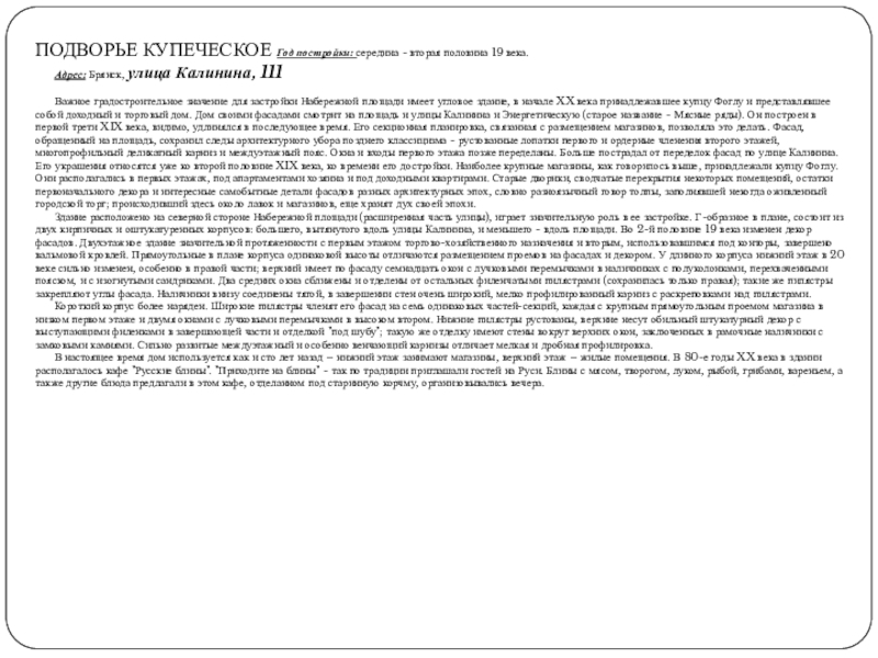 Слайд 53ПОДВОРЬЕ КУПЕЧЕСКОЕ Год постройки: середина - вторая половина 19 века.