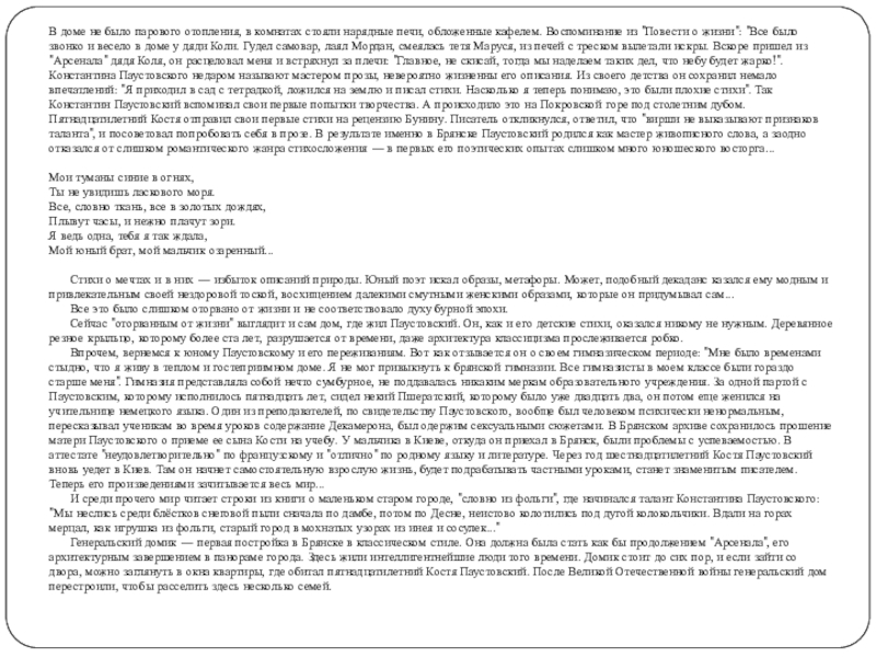 обложенные кафелем. Воспоминание из "Повести о жизни": "Все было звонко и весело в доме у дяди Коли. Гудел самовар, лаял Мордан, смеялась тетя Маруся, из печей с треском вылетали искры. Вскоре пришел из "Арсенала" дядя Коля, он расцеловал меня и встряхнул за плечи: "Главное, не скисай, тогда мы наделаем таких дел, что небу будет жарко!". Константина Паустовского недаром называют мастером прозы, невероятно жизненны его описания. Из своего детства он сохранил немало впечатлений: "Я приходил в сад с тетрадкой, ложился на землю и писал стихи. Насколько я теперь понимаю, это были плохие стихи". Так Константин Паустовский вспоминал свои первые попытки творчества. А происходило это на Покровской горе под столетним дубом. Пятнадцатилетний Костя отправил свои первые стихи на рецензию Бунину. Писатель откликнулся, ответил, что "вирши не выказывают признаков таланта", и посоветовал попробовать себя в прозе. В результате именно в Брянске Паустовский родился как мастер живописного слова, а заодно отказался от слишком романтического жанра стихосложения — в первых его поэтических опытах слишком много юношеского восторга...