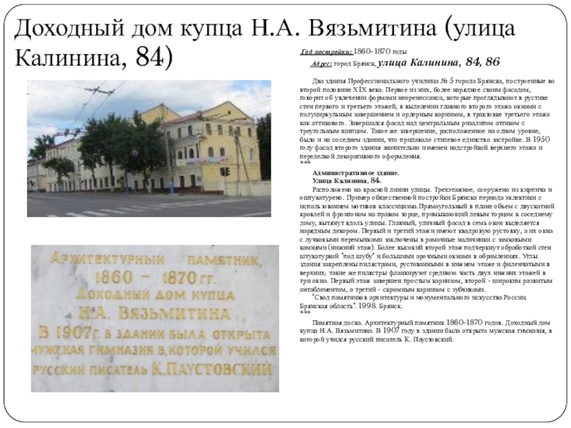 Слайд 45Доходный дом купца Н.А. Вязьмитина (улица Калинина, 84)
