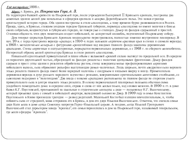 Невысокий одноэтажный прямоугольный в плане объем с вальмовой кровлей сильно вытянут по продольной оси. В середине он пересечен двухэтажной частью, образующей на фасадах ризалиты с пологими щипцовыми фронтонами. Декор фасадов сдержан и прост: углы здания и ризалитов обработаны рустом, стены завершены мелко профилированными карнизами небольшого выноса, окна обрамляют рельефно выступающие рамки-наличники. Лишь широкое, почти квадратное окно верхнего этажа ризалита главного фасада имеет более нарядный наличник с сандриком и нишками вверху и внизу. Примечательна деревянная веранда в духе русского народного зодчества с резными, завершенными оригинальными капителями столбиками, со сквозными подзорами и "полотенцами". Два входа с новыми крыльцами расположены на главном фасаде по сторонам узкого прямоугольного окна в центре нижнего этажа ризалита. В основу первоначальной планировки положена обычная схема усадебного помещичьего дома: в середине сени, справа и слева от них жилые покои, над сенями мезонин. В 1900-х гг. в доме бывал К.Г. Паустовский, приезжавший на школьные и студенческие каникулы к дяде — полковнику Н.Г. Высочанскому, который проживал здесь с семьей в небольшой квартире, выходившей окнами во Двор. В 1909 году в семье Константина Паустовского в Киеве произошла трагедия — развод родителей. Маленький Костя был излишне впечатлительным, и, чтобы избавить сына от страданий, мама отправила его в Брянск, в дом его дяди Николая Высочанского. Отметим, что сначала семья дяди Коли жила в доме купца Самохина напротив Горно-Никольской церкви. А позднее, когда Николай Григорьевич Высочанский стал директором завода "Арсенал", его семья переселилась в дом на Покровской горе, называемый генеральским, где жили офицеры "Арсенала".