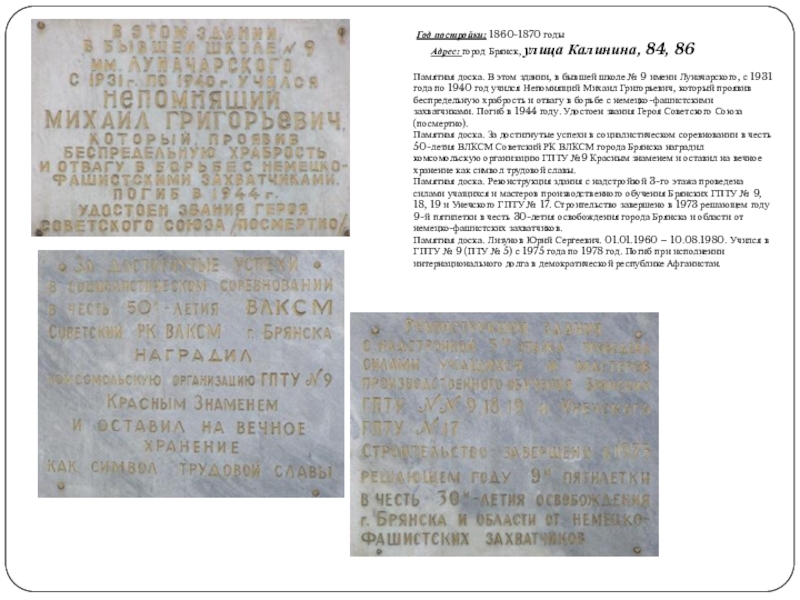 Памятная доска. Реконструкция здания с надстройкой 3-го этажа проведена силами учащихся и мастеров производственного обучения Брянских ГПТУ № 9, 18, 19 и Унечского ГПТУ № 17. Строительство завершено в 1973 решающем году 9-й пятилетки в честь 30-летия освобождения города Брянска и области от немецко-фашистских захватчиков.