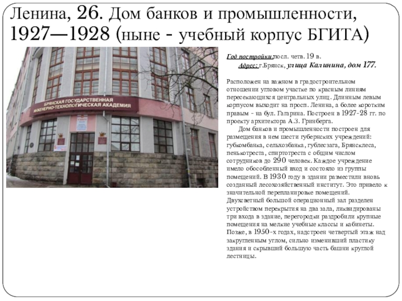 Слайд 12Ленина, 26. Дом банков и промышленности, 1927—1928 (ныне - учебный корпус