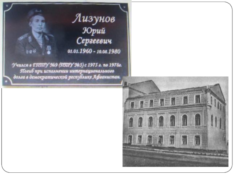 Памятная доска. Лизунов Юрий Сергеевич. 01.01.1960 – 10.08.1980. Учился в ГПТУ № 9 (ПТУ № 5) с 1975 года по 1978 год. Погиб при исполнении интернационального долга в демократической республике Афганистан.