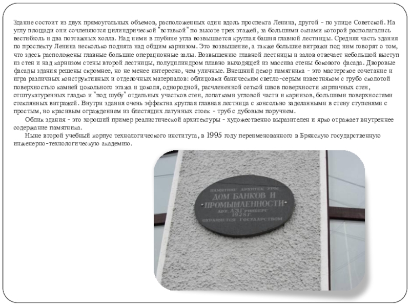 Слайд 13Здание состоит из двух прямоугольных объемов, расположенных один вдоль проспекта Ленина,