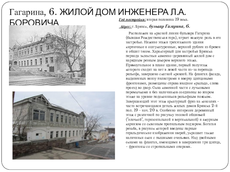 Слайд 2Гагарина, 6. ЖИЛОЙ ДОМ ИНЖЕНЕРА Л.А. БОРОВИЧА