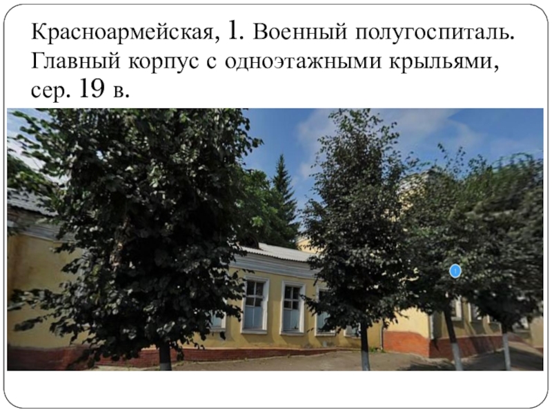 Слайд 75Красноармейская, 1. Военный полугоспиталь. Главный корпус с одноэтажными крыльями, сер. 19