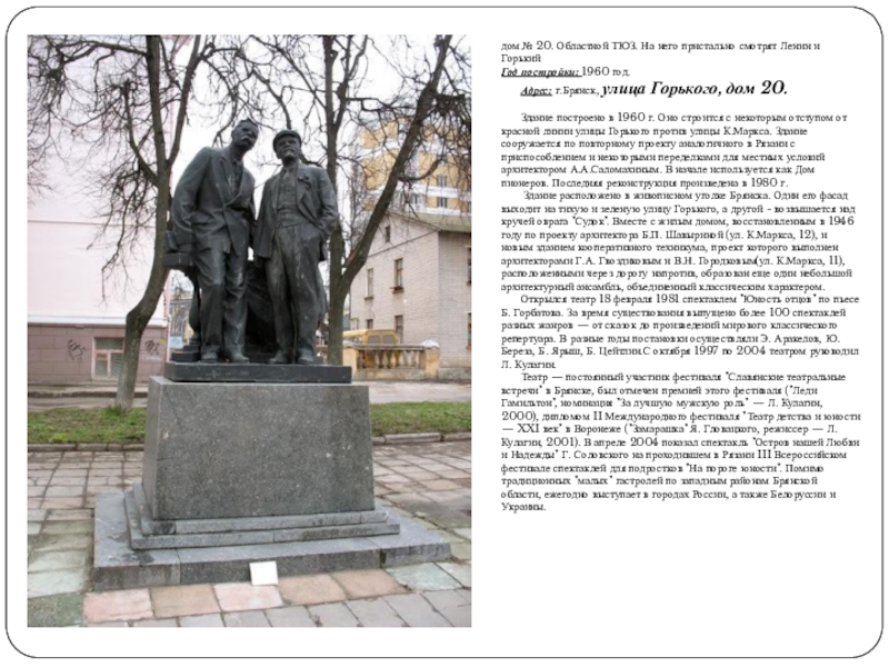 Слайд 63дом № 20. Областной ТЮЗ. На него пристально смотрят Ленин и Горький