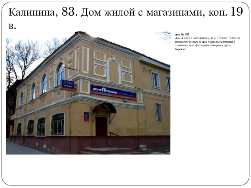 Слайд 44Калинина, 83. Дом жилой с магазинами, кон. 19 в.