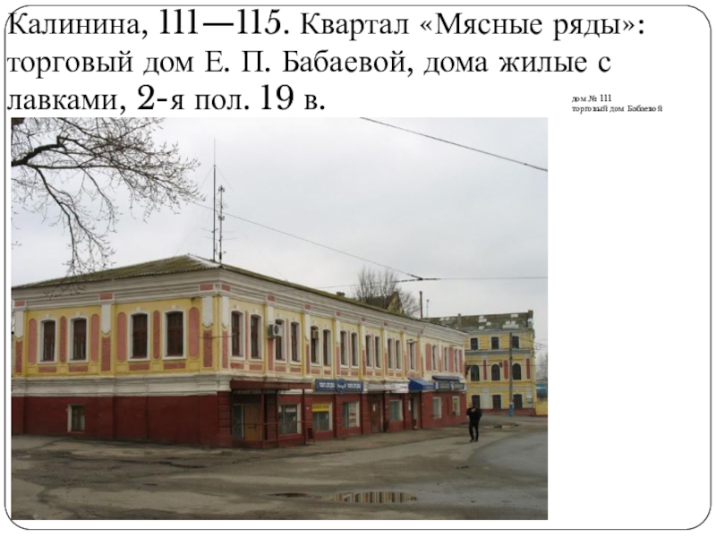 Слайд 52Калинина, 111—115. Квартал «Мясные ряды»: торговый дом Е. П. Бабаевой, дома