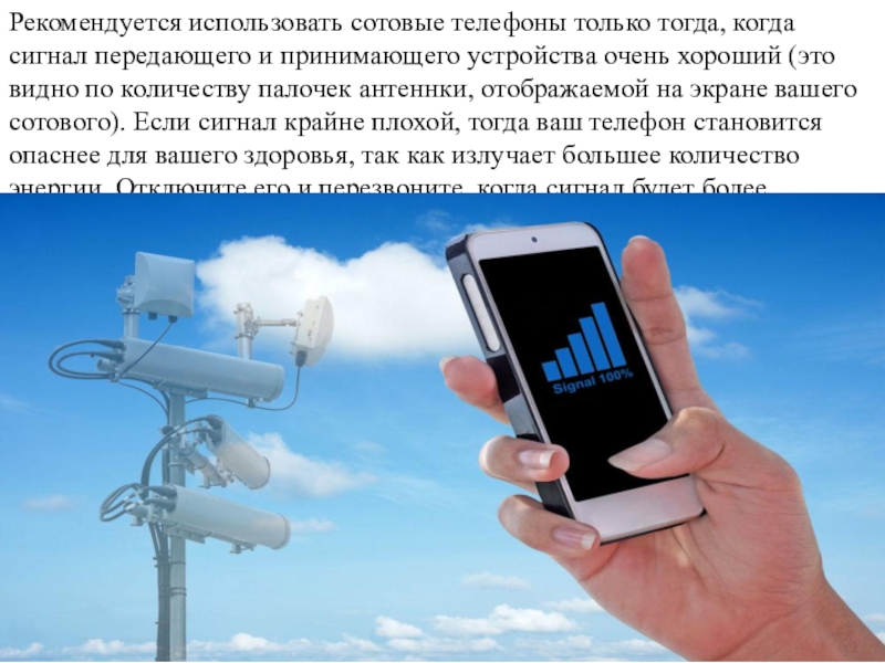 Слайд 7Рекомендуется использовать сотовые телефоны только тогда, когда сигнал передающего и принимающего