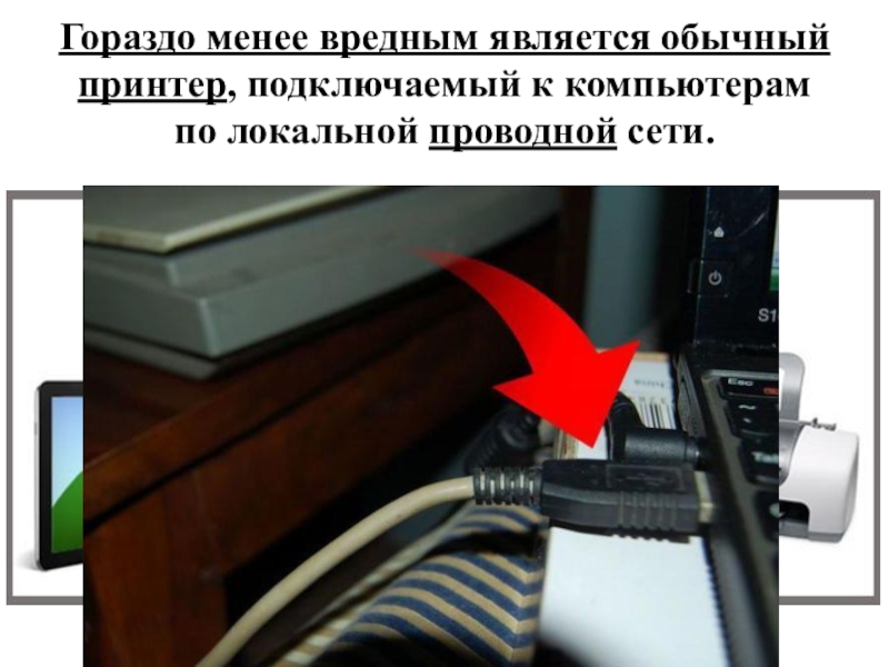 Слайд 12Гораздо менее вредным является обычный принтер, подключаемый к компьютерам по локальной