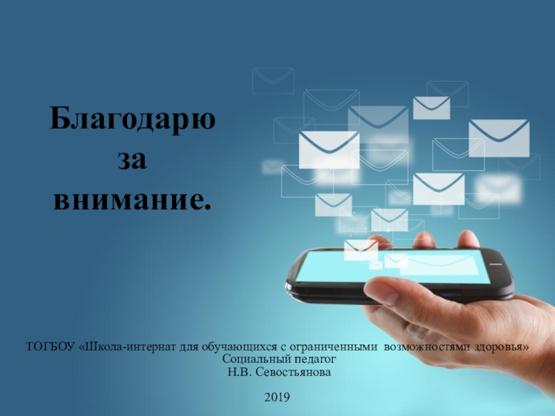 Благодарю  за  внимание.ТОГБОУ «Школа-интернат для обучающихся с ограниченными возможностями здоровья» Социальный педагог Н.В. Севостьянова2019