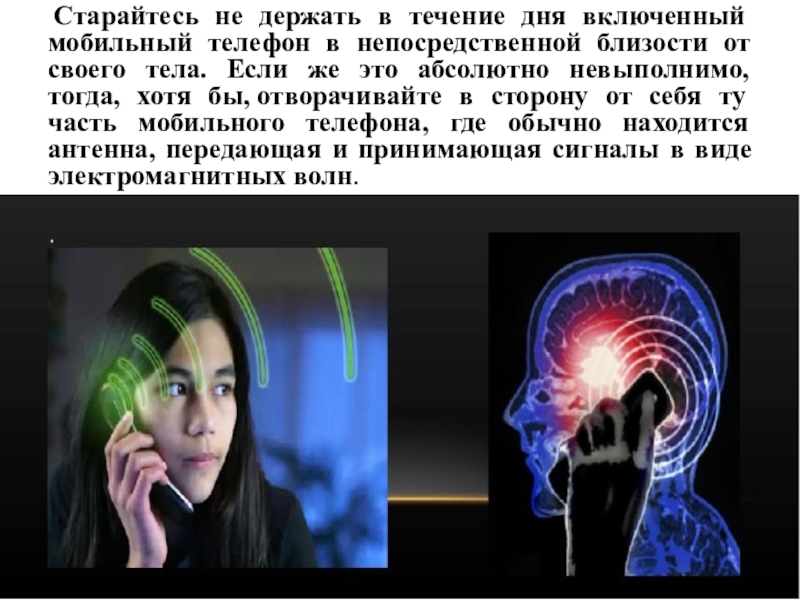 близости от своего тела. Если же это абсолютно невыполнимо, тогда, хотя бы, отворачивайте в сторону от себя ту часть мобильного телефона, где обычно находится антенна, передающая и принимающая сигналы в виде электромагнитных волн.
