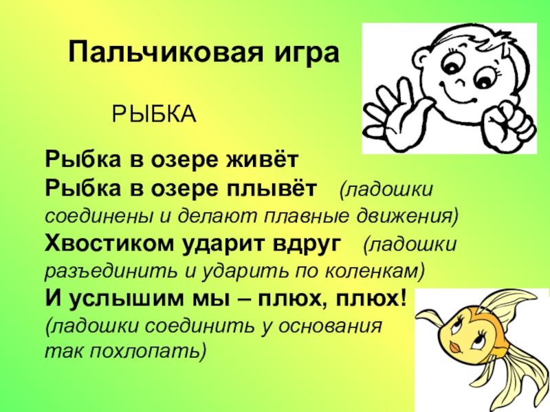 Рыбка в озере плывёт (ладошки соединены и делают плавные движения)
