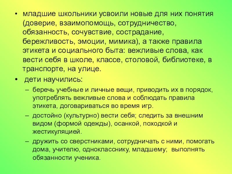 Слайд 21младшие школьники усвоили новые для них понятия (доверие, взаимопомощь, сотрудничество, обязанность,