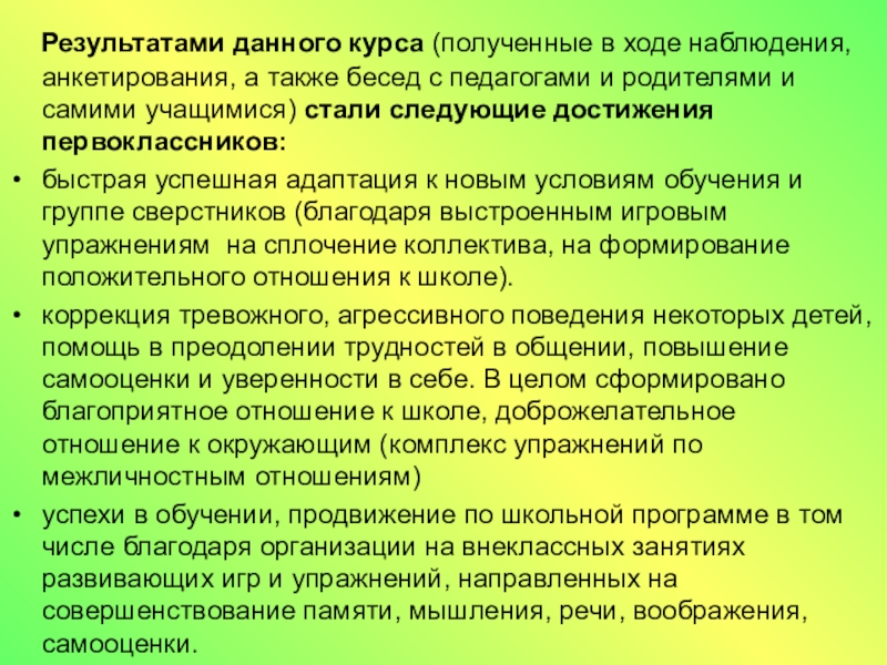 Слайд 20 Результатами данного курса (полученные в ходе наблюдения, анкетирования, а