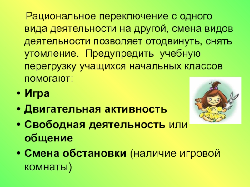 Слайд 5 Рациональное переключение с одного вида деятельности на другой, смена