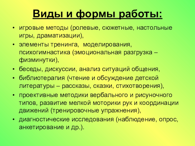моделирования, психогимнастика (эмоциональная разгрузка – физминутки),