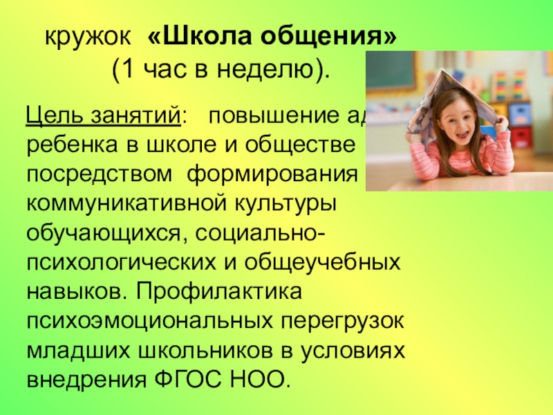 повышение адаптации ребенка в школе и обществе посредством формирования коммуникативной культуры обучающихся, социально-психологических и общеучебных навыков. Профилактика психоэмоциональных перегрузок младших школьников в условиях внедрения ФГОС НОО.