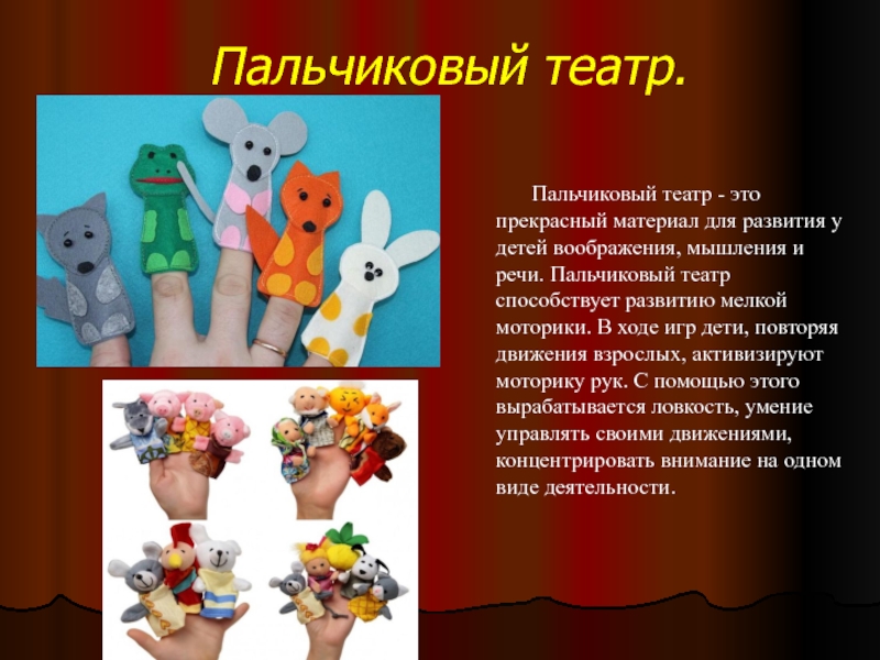 прекрасный материал для развития у детей воображения, мышления и речи. Пальчиковый театр способствует развитию мелкой моторики. В ходе игр дети, повторяя движения взрослых, активизируют моторику рук. С помощью этого вырабатывается ловкость, умение управлять своими движениями, концентрировать внимание на одном виде деятельности.