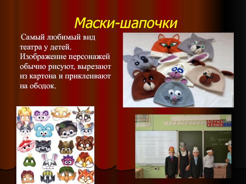 Маски-шапочки   Самый любимый вид театра у детей. Изображение персонажей обычно рисуют, вырезают из картона и